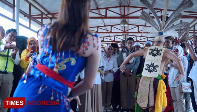 TIMES Demak/Cawapres Nomor urut 02, Sandiaga Salahuddin Uno disambut dengan upacara adat Tetek Pantan saat tiba di Bandara Tjilik Riwut Palangkaraya, Kalimantan, Senin (04/02/2019). (FOTO: Tofik For TIMES Indonesia)