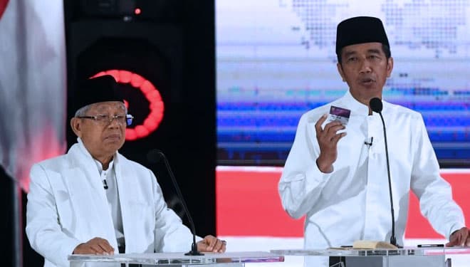 TIMES Demak/Pasangan capres-cawapres nomor urut 01 Joko Widodo (kiri) dan Ma'ruf Amin mengikuti debat kelima di Hotel Sultan, Jakarta, Sabtu (13/4/2019). (FOTO: Wahyu Putro A/Antarafoto)